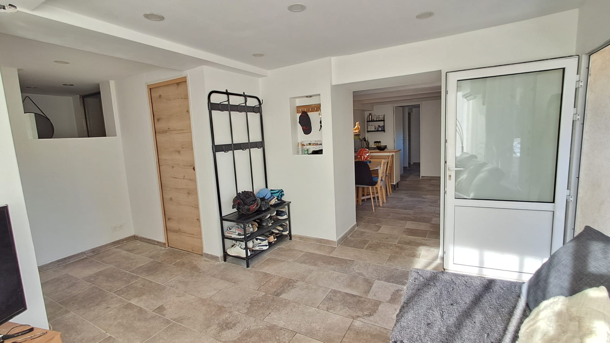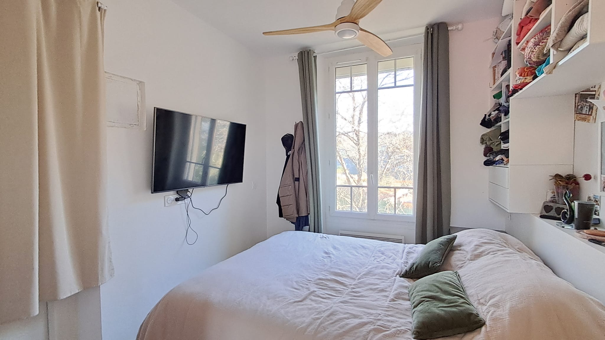 La partie T3 de 56.6m² carrez, située en rez-de-jardin se compose d’un salon-séjour donnant sur cuisine, de deux chambres disposant chacune de leur point d’eau, d’un WC séparé, ainsi que d’une climatisation réversible dans le séjour et la chambre parentale